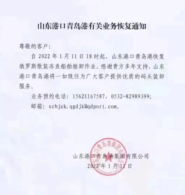 “青島港于1月11日下午6:00恢復(fù)俄羅斯凍魚船的取卸業(yè)務(wù),”港口管理公司山東港青島港集團宣布。