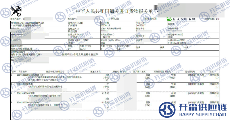【本文結語】 上述就是廣州機場測量系統配件進口報關代理服務【清關案例】的全部內容,希望能對您有所幫助,如有廣州進口清關上任何疑問及問題可隨時在線聯系我們或撥打 18002611553,開森供應鏈擁有豐富的廣州進口清關操作經驗及案例,10余年進口經驗為您所用,各類進口疑難都能為您一一解答及協助快速處理解決!