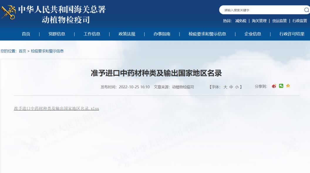 海關(guān)總署對(duì)進(jìn)境中藥材實(shí)施檢疫準(zhǔn)入制度,包括產(chǎn)品風(fēng)險(xiǎn)分析、監(jiān)管體系評(píng)估與審查、確定檢疫要求、境外生產(chǎn)企業(yè)注冊(cè)登記以及進(jìn)境檢疫等。目前,我國(guó)已準(zhǔn)予91個(gè)國(guó)家、地區(qū)的上百種中藥材,企業(yè)可在海關(guān)總署—?jiǎng)又参餀z疫司—檢疫要求和警示信息(http://dzs.customs.gov.cn/dzs/2746776/4445554/index.html)查詢(xún)準(zhǔn)予進(jìn)口中藥材種類(lèi)及輸出國(guó)家地區(qū)名錄信息(也可咨詢(xún)開(kāi)森供應(yīng)鏈,我們將為您提供最新詳細(xì)名單目錄)